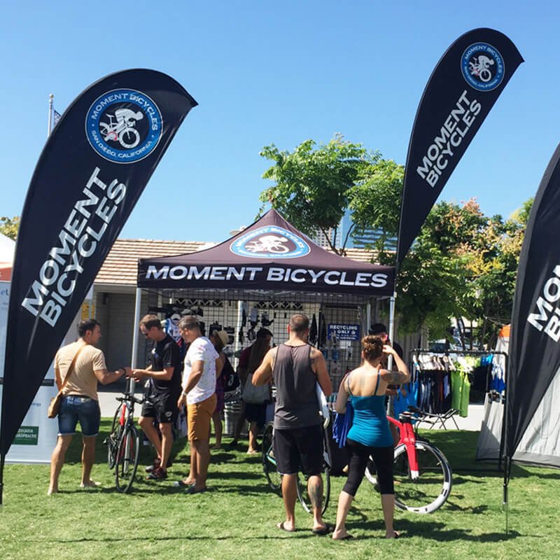 Design a double-sided teardrop flag with distinct logos on each side to maximize brand exposure and attract more visitors at high-traffic trade show booths.