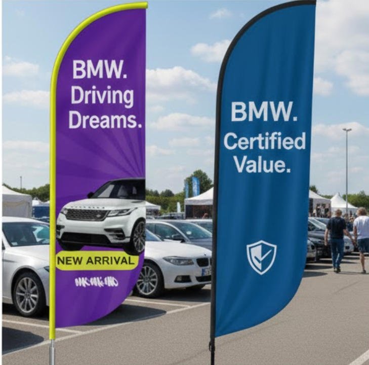 Swooper feather flags are a favorite for car dealers. Their tall, waving shape and bright graphics make them hard to miss. They move with the wind, so they always attract attention. These flags last through sun, rain, and wind, making them perfect for seasonal promotions.