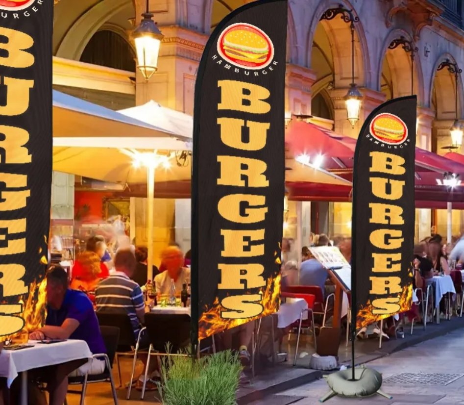 Restaurant flags help your outdoor place stand out. They are tall and wave in the wind. People walking by will notice them. These flags are a good way to advertise. They help you get noticed and bring in more customers. The moving flags catch people’s eyes. You spend less money than other ways. Still, you get a great way to advertise that works.